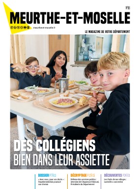 6 pages consacrées à l'actualité des territoires d'action du Département, dont les travaux de la côte du Ratentout (1,2 M€) à Longwy ; la nouvelle caserne Nancy-Rives de Meurthe (21 M€) à Nancy et la cuisine centrale du Grand Toulois (1,8 M€ du CD54) en Terres de Lorraine ; 4 pages "Balades" consacrés aux fruits du département ; 4 pages "Découvertes" consacrées à l'actualité des sites du Conseil départemental (Cité des paysages, château de Lunéville, Médiathèque départementale, Archives départementales - Centre des mémoires Michel-Dinet, dont l'exposition "Couleurs d'humanisme") ; un zoom sur ENS de la tourbière de Bertrichamps et le portrait de la directrice du Théâtre de la Manufacture, Julia Vidit.